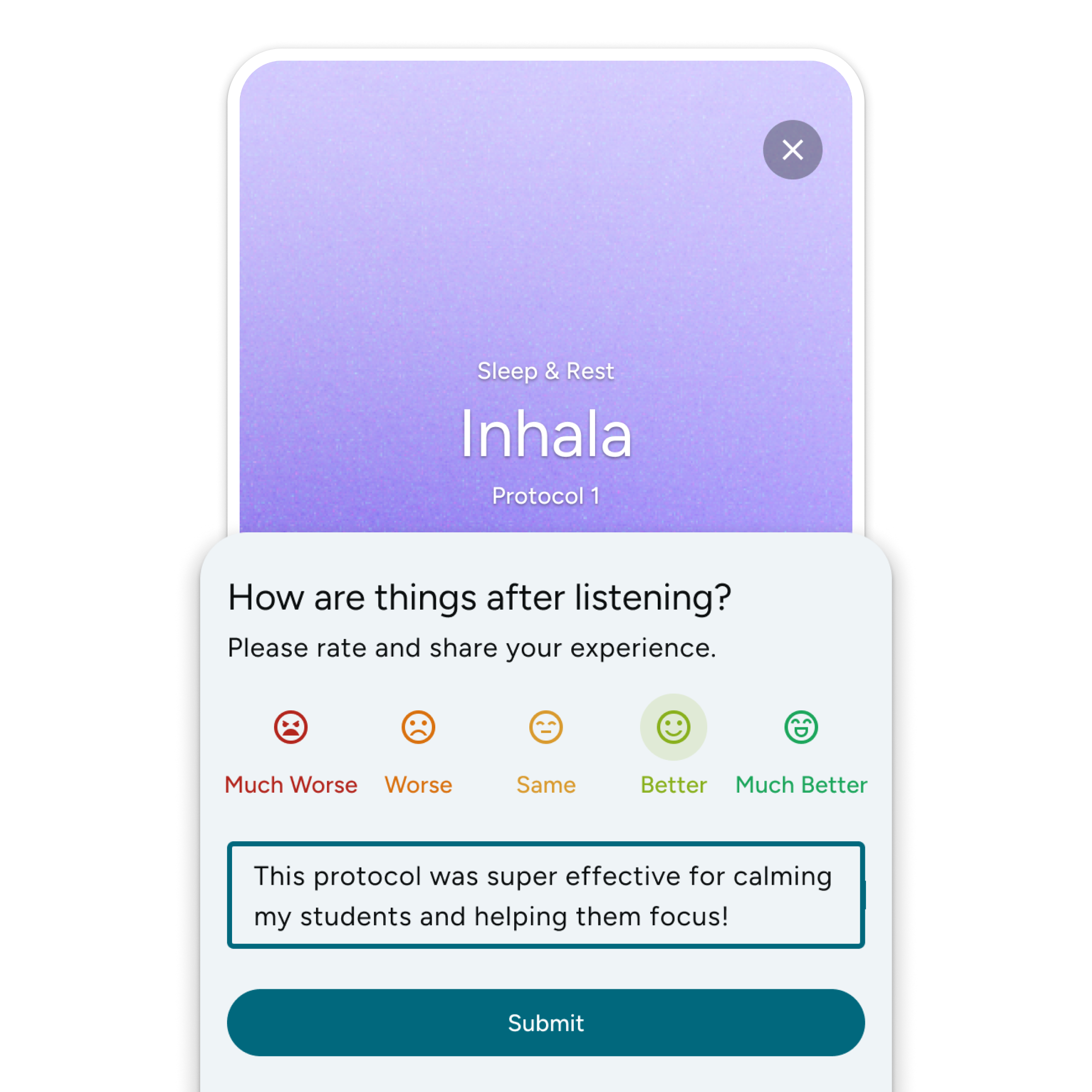 Voice-guided tracks combined with calming music for activities like mindfulness, relaxation, and breathing exercises. These protocols assist students in managing transitions, recovering from stress, and preparing for focus-demanding tasks.